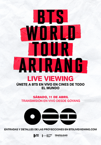 La realeza del pop, BTS, regresa a los escenarios internacionales con su esperada gira mundial, la primera a gran escala en casi cuatro años. La gira recorrerá 34 ciudades en todo el mundo, con un total de 82 conciertos, comenzando con presentaciones emblemáticas en Goyang (Corea del Sur) y Tokio (Japón), lo que representa un récord histórico en cuanto a fechas de gira para el género del K-pop. No te pierdas la oportunidad de vivir dos conciertos completos, transmitidos en vivo en salas de cine de todo el mundo. Bajo el título ARIRANG, la gira mundial de BTS presenta su quinto álbum completo, que refleja la identidad del grupo desde una perspectiva honesta y emociones universales como el anhelo y el amor profundo, plasmadas en una música que los define en sus propios términos. Con un espectacular diseño del escenario en 360 grados, el espectáculo ofrece una experiencia inmersiva que coloca al público en el centro mismo del show. Disfruta de los momentos más electrizantes del esperado regreso artístico de BTS en los cines de todo el mundo, el 11 de abril desde Goyang y el 18 de abril desde Tokio